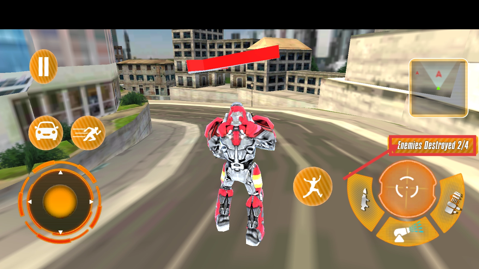 持续操控机器人消灭敌人,当前进度为【Enemies-Destroyed-2/4】,请继续推进,完成本关卡的杀敌目标。