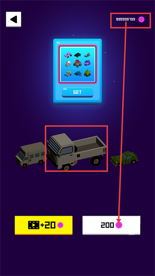 1、消耗200个紫色货币,点击GET按钮解锁新车辆,留存999999789个紫色货币以备后续解锁使用。