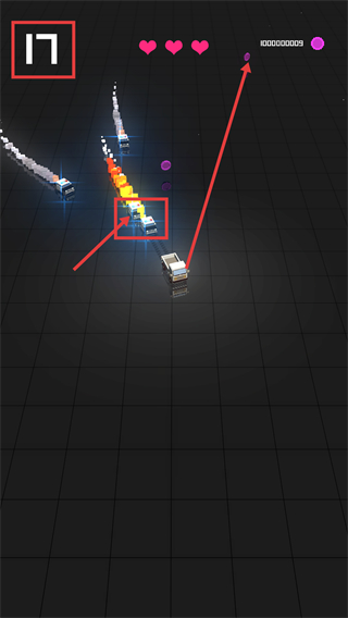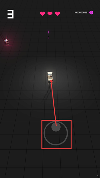 2、借助虚拟摇杆操控车辆行进,维持【3-颗心】的生命值,在网格状场景里避开警车的追击。