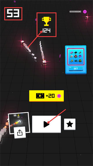 4、关卡结束后,查看【奖杯-124】和分数【53】,点击继续按钮进入下一局,也可以通过观看视频获得【+20-紫色货币】。