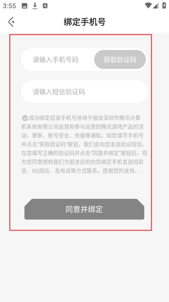 4、进入绑定手机号页面后,填写手机号码与验证码,接着点击【同意并绑定】按钮,就能完成手机号的绑定操作啦。