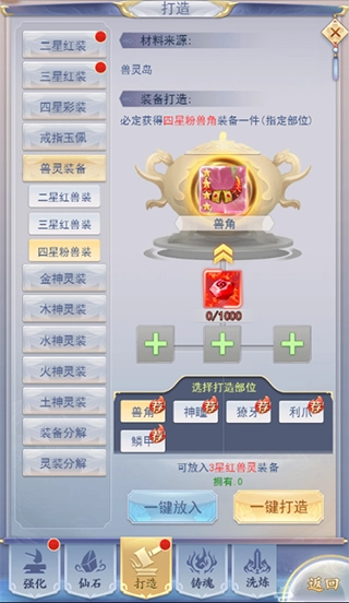 兽角的获取途径有两种:一是击败灵兽岛上的神兽,二是和其余四件灵兽装备一样,消耗兽源石进行打造。