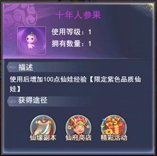 人参果是帮助他们成长、提升仙龄的道具,不过只有当人参果和仙娃品质相同时才能使用。