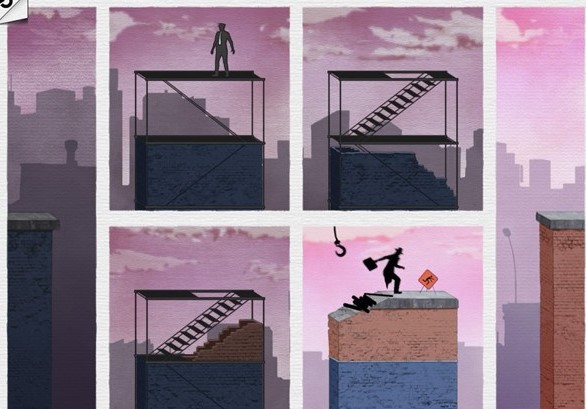 我们唯一能做的就是想办法阻止主人公靠近那块破损的墙壁。具体方法很简单,只需按照下图所示调整3、4、5号图片的位置就行。这样做有两个好处:一是主人公能从警察上方经过,避开警察的视线;二是可以直接通过水管滑到下一层,不用再被豆腐渣工程的建造商坑害。这可真是一举两得!