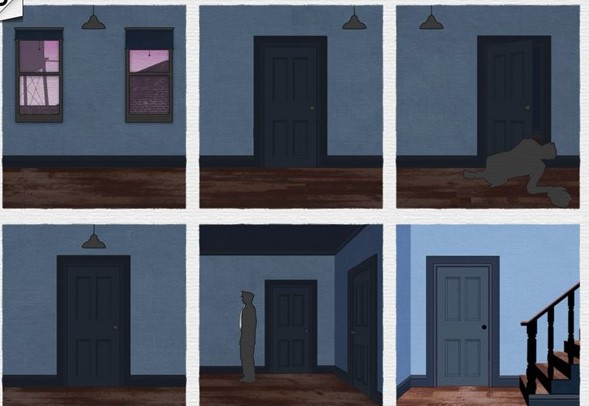 接着切换到第三个场景,倒霉的主角在错综复杂的房间里来回穿梭,无奈运气不佳,一时慌了神,被早已埋伏在此的警察当场抓获……要是我们按照下图调整插画的布局,主角就会运气爆棚,避开警察后就能从楼梯顺利逃脱。我也说不清缘由,自从研究了致命框架的攻略,就不自觉地偏向主角这边,明明知道和警察对抗是不对的,可还是忍不住为一次次化险为夷的黑衣人喝彩加油。