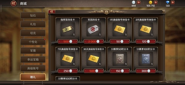 在赠礼商城里,玩家能够给自己的好友或者所在军团的成员赠送坦克、涂装、道具以及英雄勋章礼包。当玩家等级达到16级时,赠礼商城就会解锁。赠礼商城主要包含友谊币、赠送坦克、