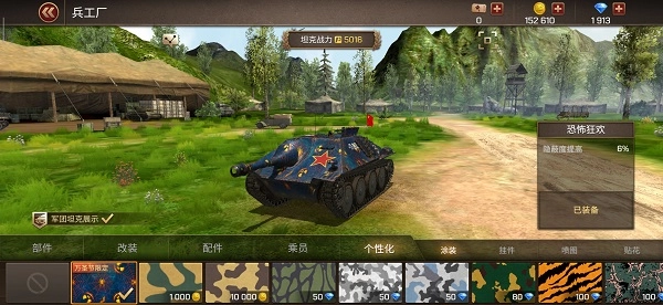 三、如何设置需要展示的坦克呢? 1. 进入兵工厂的个性化界面,勾选左下方的“军团坦克群展示”框即可。若要更换军团坦克群里展示的坦克,重新选择坦克并勾选该框就行。要是没切换涂装和挂件的勾选状态,就会显示默认的;如果切换了,就展示当前选择的。即使没有加入军团,兵工厂的个性化界面也会显示“军团坦克群展示”框,这样方便加入军团时第一时间在军团坦克群中展示。