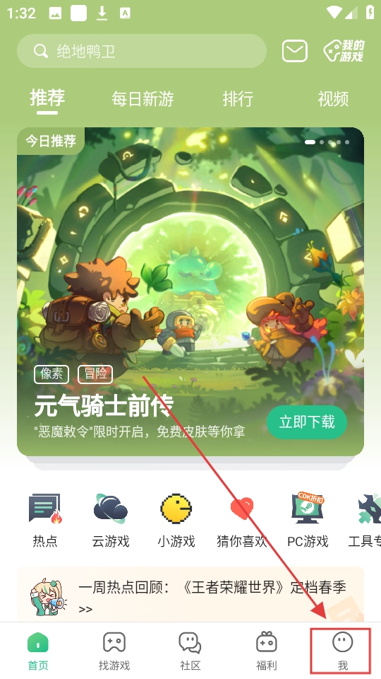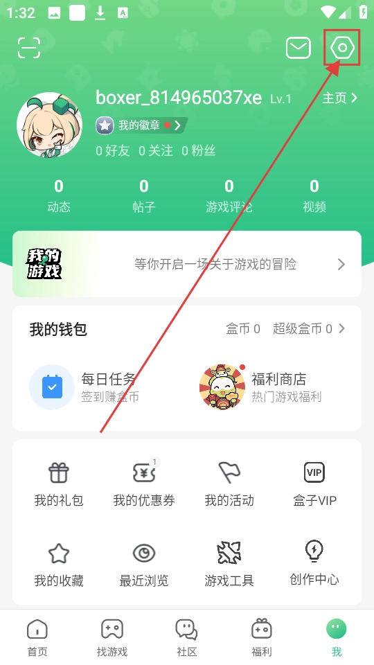 1、打开4399游戏盒后,点击底部的“我”,再点击右上角的设置按钮;