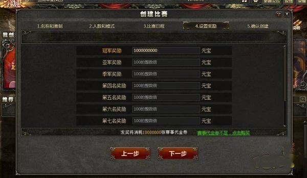 当然如果玩家不想耗费元宝,也可以直接点击“下一步”,如此创建后的赛事是没有奖励的,只需要赛事券就好。