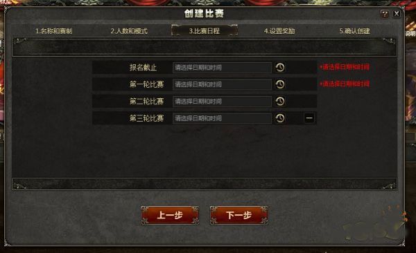 第三步:填写比赛日程。比赛日程分为报名截止时间和比赛起止时间,可以具体到小时和分,最多可进行三轮比赛。