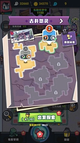 点击右下角的【探索】按钮,就能看到丰富的地点与关卡。点击【出发探索】,不仅有机会获取碎片,还能结识并招募更多鬼精灵到鬼屋工作。这些碎片可用于合成进阶鬼怪,用途十分重要。