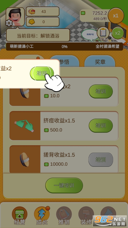 这款游戏几乎没什么难度,特别容易上手,就算没有教程引导,也能轻松玩转;游戏机制很简单,核心就是经营一间浴室,通过升级各类设施,一步步把它打造成更豪华的洗浴城。