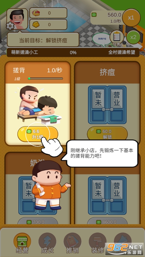 玩游戏时可以从最简单的开始,跟着提示给客人搓背就行。