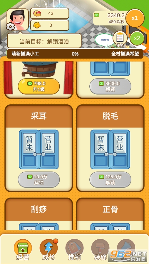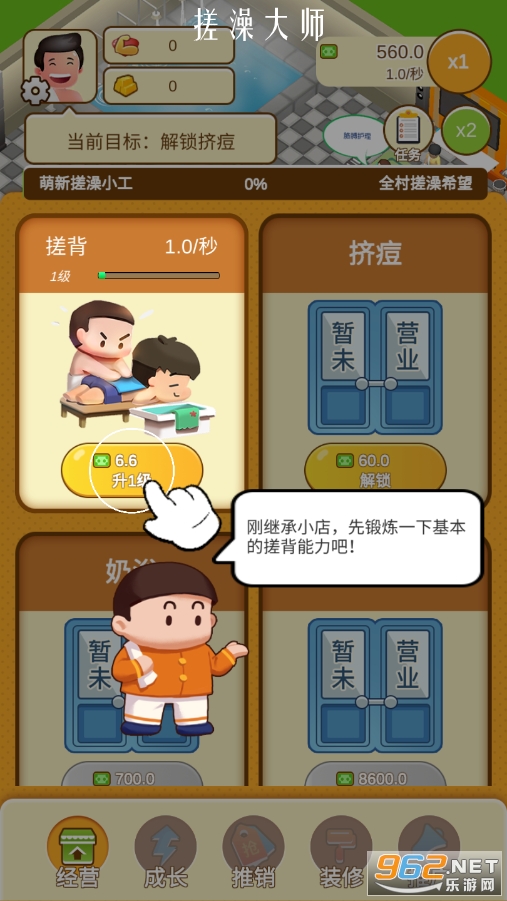 《搓澡大师安卓版》是一款主打放置玩法的搓澡中心模拟经营游戏,采用Q版卡通的画风设计,包含多样的玩法内容。玩家能够持续完成任务,解锁搓背、挤痘、奶浴、酒浴、采耳、脱毛、刮痧、正骨、拔罐、针灸等众多项目,还可以不断培训员工、提高收益、升级自己的搓澡中心,感兴趣的话就来体验吧!