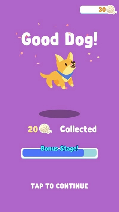 当屏幕上出现“Good Dog”字样时,就意味着目标已经达成;“5Collected”代表本次共收集到5个物品;进度条的显示表明你已成功解锁2个区域;集齐5颗星星就能兑换全新装扮,现在点击“Tap to Continue”继续你的冒险之旅吧。