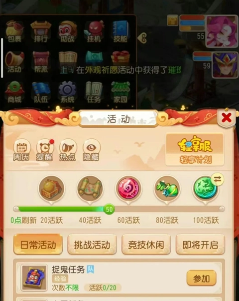 中午:捉鬼20-挖宝图10(中午可以休息着挂机一会,找个队伍一直挂机即可)
