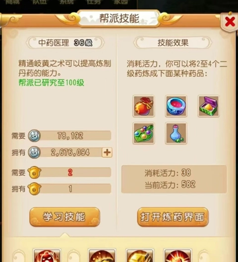 前期我们尽快加入一个帮派,过帮派任务会给帮贡,帮贡可以点一些制作技能,然后点修炼技能的时候选择炼药或者烹饪,两个各有各的优点,都可以。