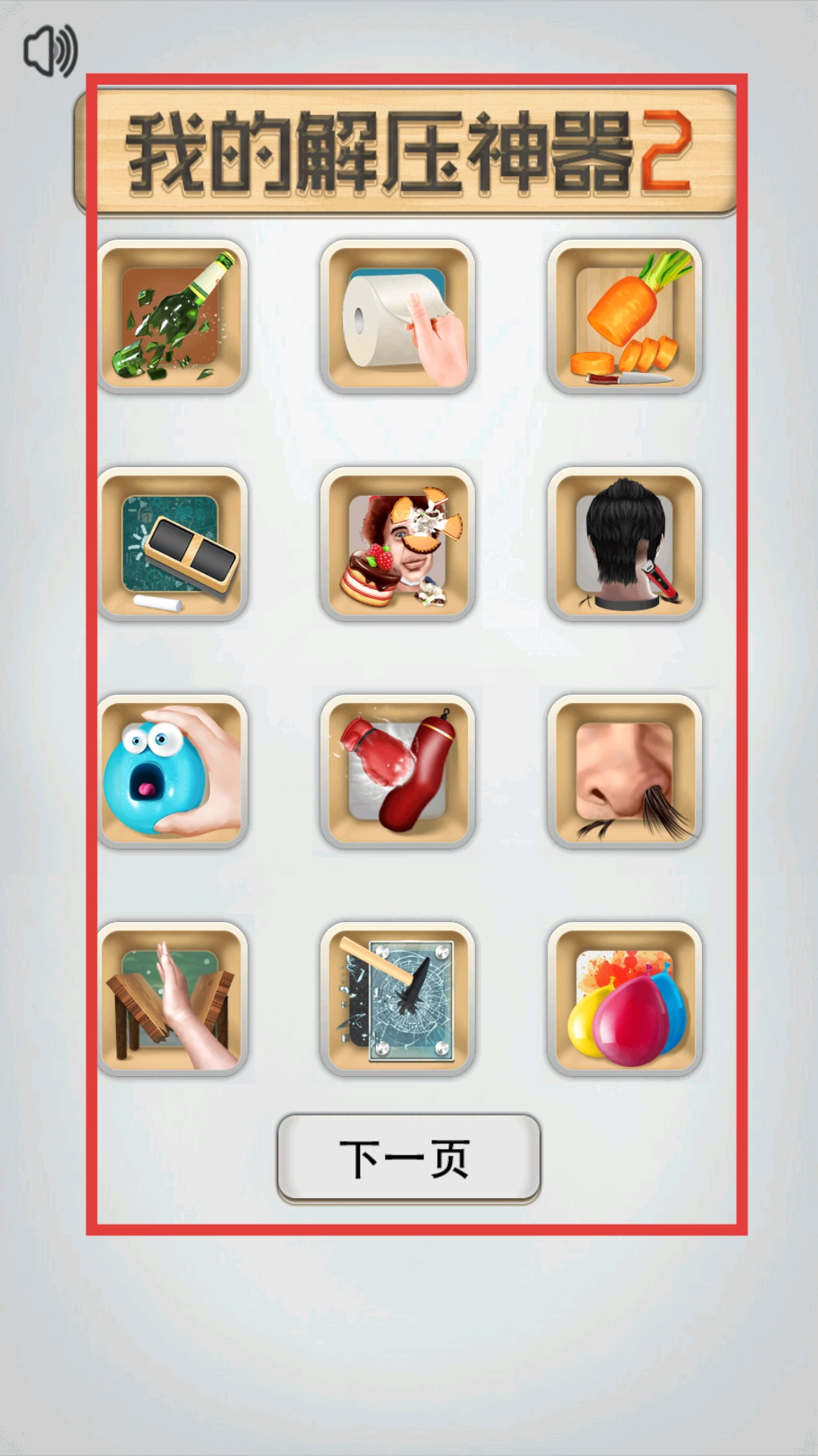 打开我的解压神器2,进入主界面后,能看到界面上陈列着碎酒瓶、卷纸、切胡萝卜等多个解压项目图标,点击想要操作的目标解压项目图标,即可进入对应的项目操作场景。