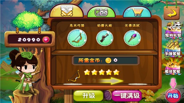 在道具界面中,玩家可以点击空间武器下方的升级按钮,以此强化弓箭、火枪与法杖的能力。点击宠物切换区域可解锁新的宠物,点击购物车图标能够解锁各类道具,而点击界面右侧的礼包选项,则可以消耗钱币进行购买。