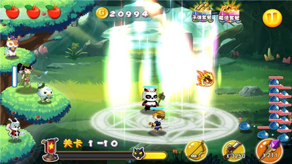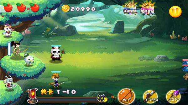 你率领一群身手出众的小伙伴并肩作战,比如:箭术精准的阿布、刀法凌厉的浣熊GG、精通医术的兔子MM、力大无穷的熊猫大侠、拥有神奇魔力的猫咪小姐等,通过击败敌人来闯过各个关卡。