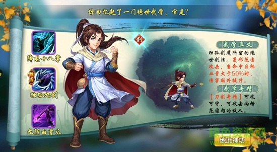 这个界面支持使用突破丹为侠客练功,突破丹可从商店购买或日常扫荡获取。每次练功都会增加侠客的属性,当硬功、软功、内功、外功这四种功法全部练完后,就能消耗铜币进行突破。点击“快速练功”会自动消耗突破丹,把侠客直接提升到可以突破的状态。