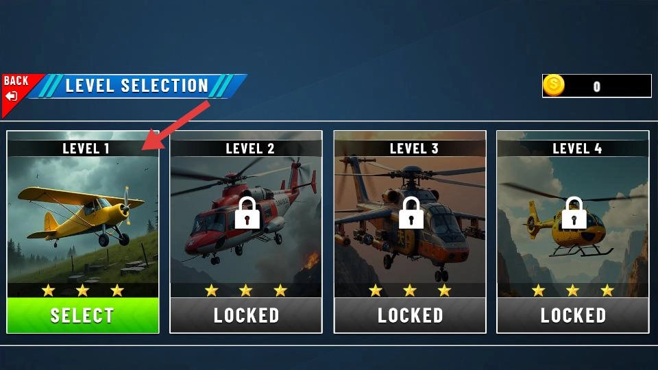 在主界面点击PLAY按钮,就能进入关卡选择页面。其中Level1飞机关卡处于解锁状态,点击SELECT即可进入游戏,之后通过操控虚拟摇杆来驾驶直升机。