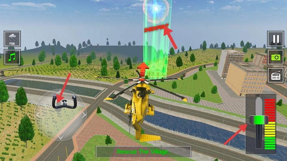 在游戏里,玩家需要操控直升机,按照屏幕上“Rescue The Village”的提示,通过虚拟操控台来调整飞行姿态,穿越各种地形抵达CHECKPOINT,完成救援流程,从而逐步熟悉并掌握飞行技巧。