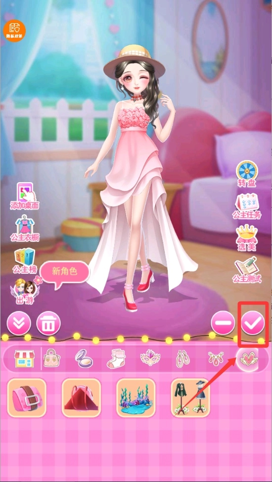 给角色搭配好心仪的造型后,点击界面右侧的确认按钮就能保存装扮。这个按钮是绿色对勾的样式,确认之后新形象会马上生效。