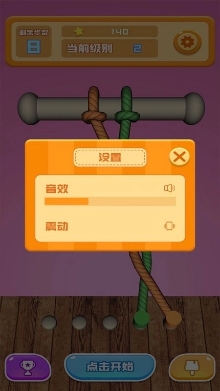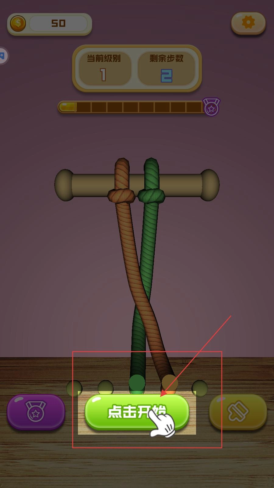玩家进入游戏后,点击绿色的【点击开始】按钮,即可开启解绳关卡的挑战。