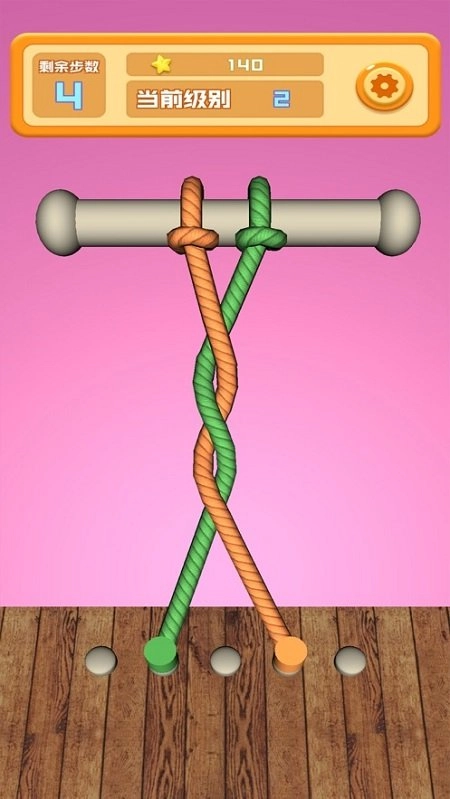 在第1关的解绳关卡里,能看到交叉在一起的橙色与绿色绳子,着手尝试解开它们时,剩余步数为3步。