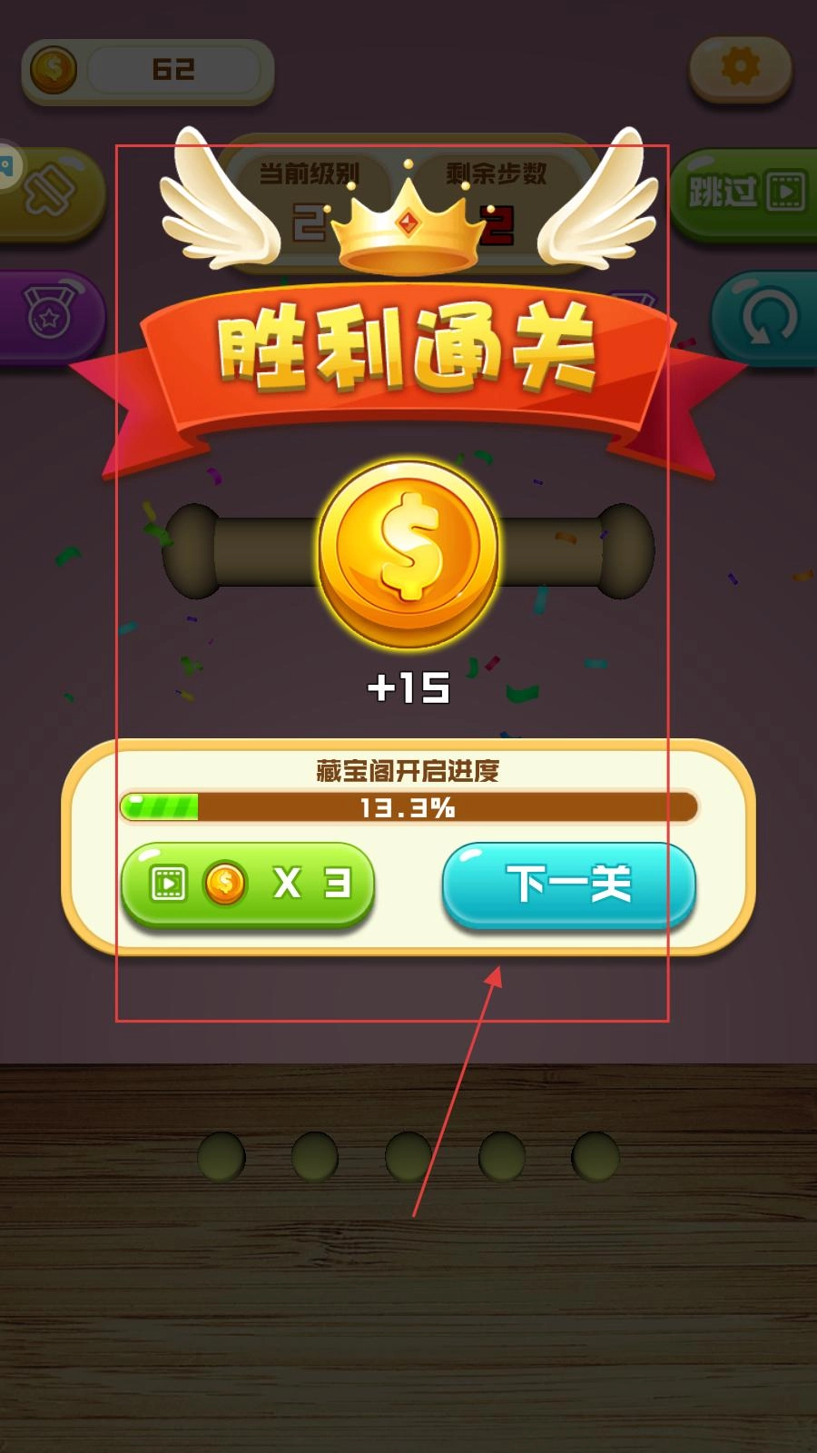 成功解开绳子后,屏幕会显示胜利通关的界面,您将获得金币奖励,点击【下一关】按钮就能继续进行挑战。