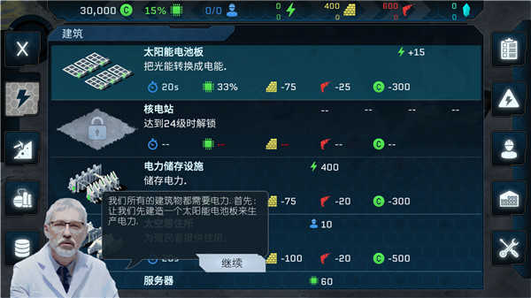 首先打开建造菜单,布置“太阳能电池板”作为初期电力供给,保障基地运转需要的稳定能源供应。