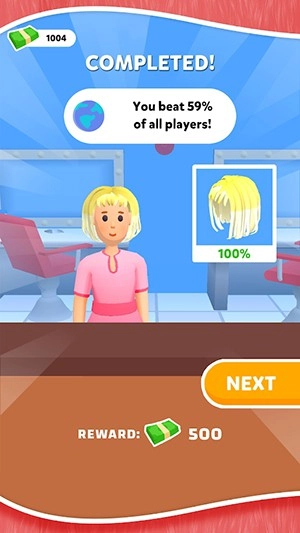 完成发型设计后,会弹出成果展示界面,在这里可以看到顾客分享的新发型,以及获得的点赞数和奖金金额。如果想获取更多收益,点击绿色按钮观看广告就能让奖金翻倍;要是不想看广告,点击“NO, THANKS”即可直接收下150美元,随后便可开启下一关的挑战。