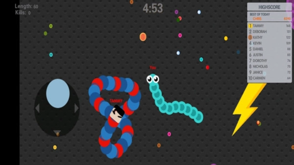 成长机制清晰明了:游戏初始阶段,所有玩家操控的蠕虫体型都较为短小,它们需要通过吞食彩色原点来逐步增加自身长度;而长度的增长会直接让蠕虫的竞争力得到提升,整个成长路径简洁直观,很容易理解。