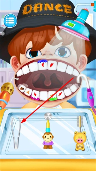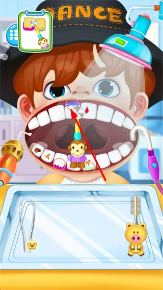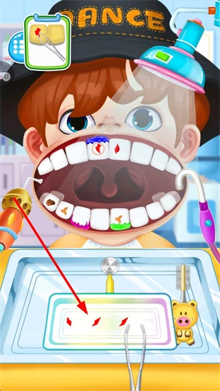 进入游戏界面后,从托盘里挑选合适的工具,针对牙齿上的污渍、蛀斑等状况,用对应的工具开展清洁或修复工作,推动诊疗流程向前进行。