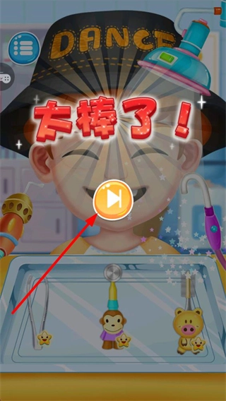 完成所有牙齿的诊疗操作后,屏幕会弹出“太棒了”的通关提示,点击播放按钮就能进入下一个诊疗关卡。