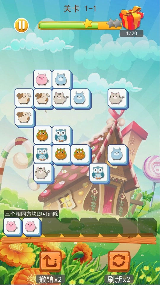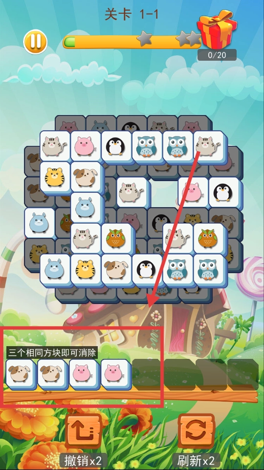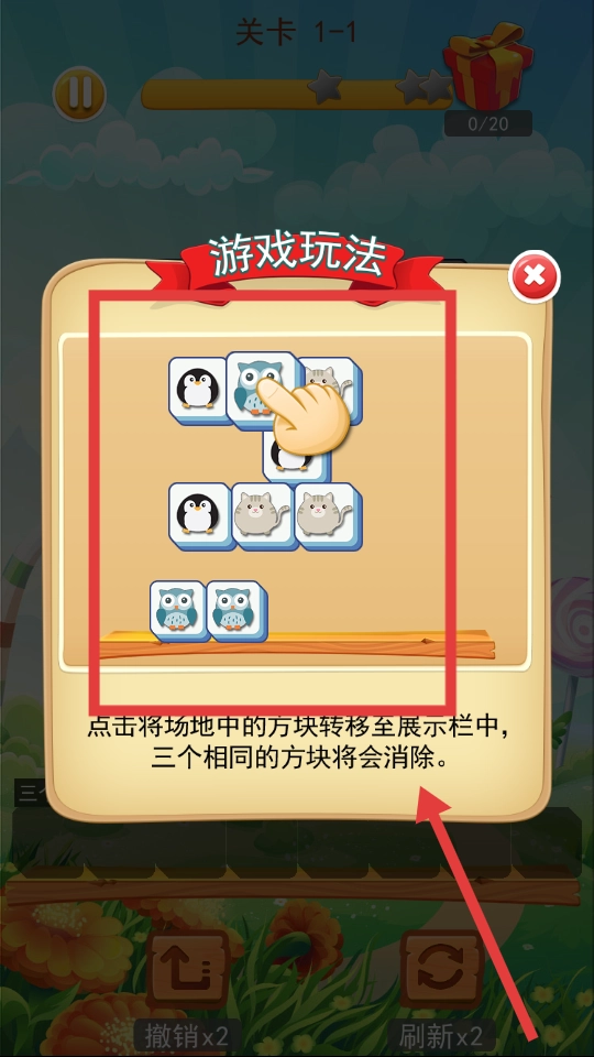 进入关卡后会弹出游戏玩法提示框,里面清楚说明了操作方法:点击场地里的方块,就能把它移到下方的展示栏,要是展示栏里出现三个一样的方块,就可以完成消除。