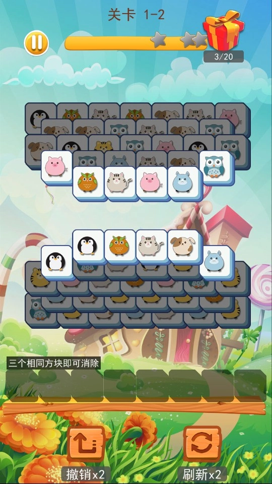 熟悉规则后就可以开始操作了,点击场地里的方块,把它移到展示栏,一直重复这个操作,等展示栏里凑够三个一样的方块,就能成功消除,让游戏继续往前推进。
