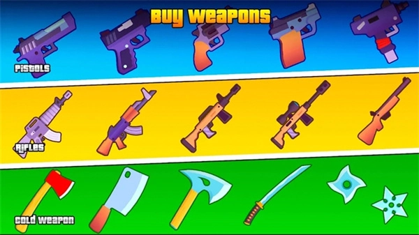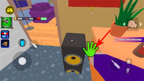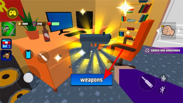 3、进入室内场景后,点击红色箭头指向的weapons按钮,获取场景内的武器道具,提升角色的战斗能力做准备。