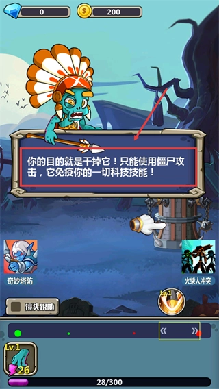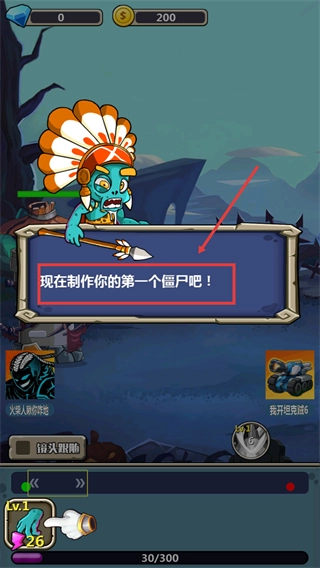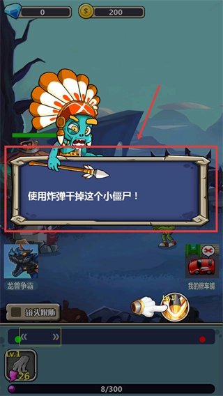 1、按照提示用炸弹攻击指定的小僵尸,达成初期战斗目标,从而快速掌握基础操作步骤。