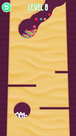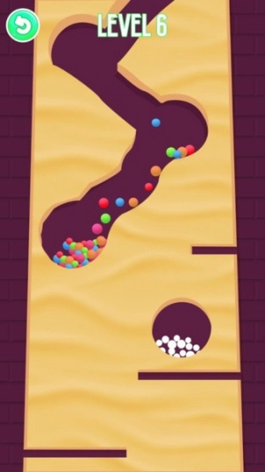 挖沙引球的玩法是这样的:用手指在沙堆里划出通道,让彩色小球能顺利滚到白球堆那里完成染色。每次成功给一组小球染好颜色,都会让人充满成就感,很适合休闲益智类的场景。