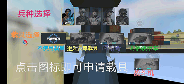 进入游戏后,屏幕会先出现短暂的模糊效果,随后弹出该界面,此时便能选择兵种(包括突击兵、机枪兵、侦查兵、医疗兵、狙击手)与载具(如阿帕奇、两栖装甲车、战斗机等),点击对应图标即可进入下一步操作。