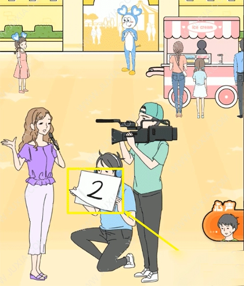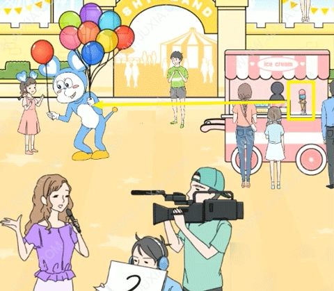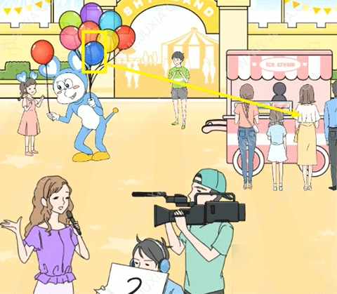 1、从穿人偶服的人手里拿过气球,用这个气球把冰淇淋车最右侧的女子带到空中。