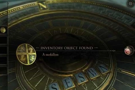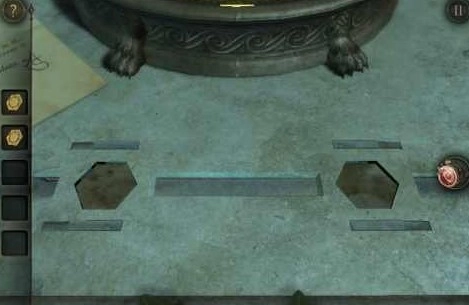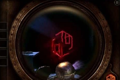 还记得八角桌上那三个镶嵌的图案吗?把那个奇特的投影仪(或者叫探照灯也行)拉近一些,戴上目镜,就去找这三个图案吧!第一个在左中位置,是个像翻转过的Z字母的图案。