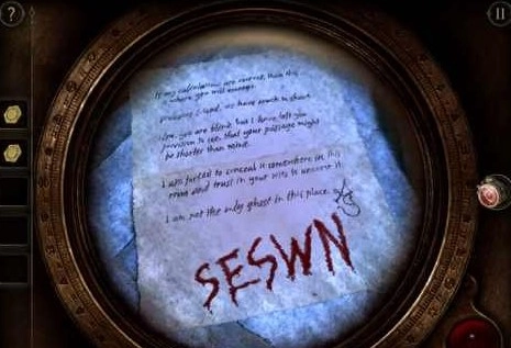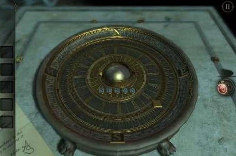 小球就装在这个巨大的指南盘里。不过密码还不清楚,其实密码就在最开始看到的那封信上,只是得用目镜才能看。在The Room系列里,普通纸质信件包含过关信息的情况其实很少见,但这次就有这样一个例子。