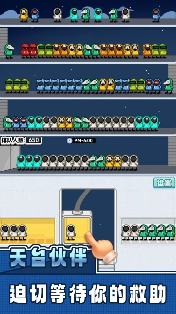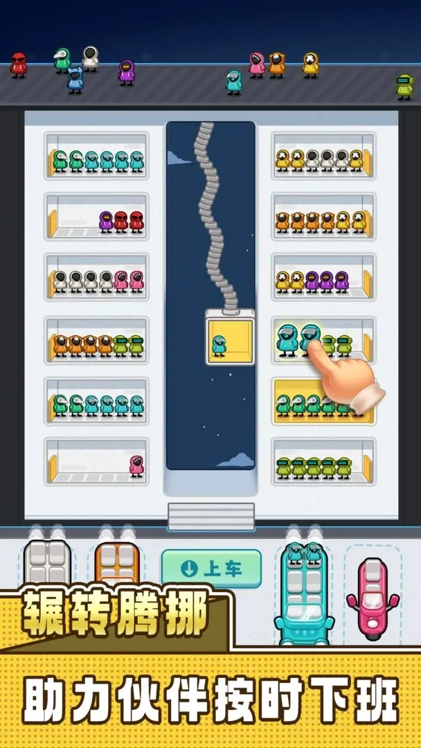 1.掌握游戏核心机制:本游戏以打工人为设计灵感,玩家需在电梯内操作不同颜色的小人,将其送至相应颜色的汽车上。通过颜色匹配实现消除,最终让打工小人顺利下班回家。