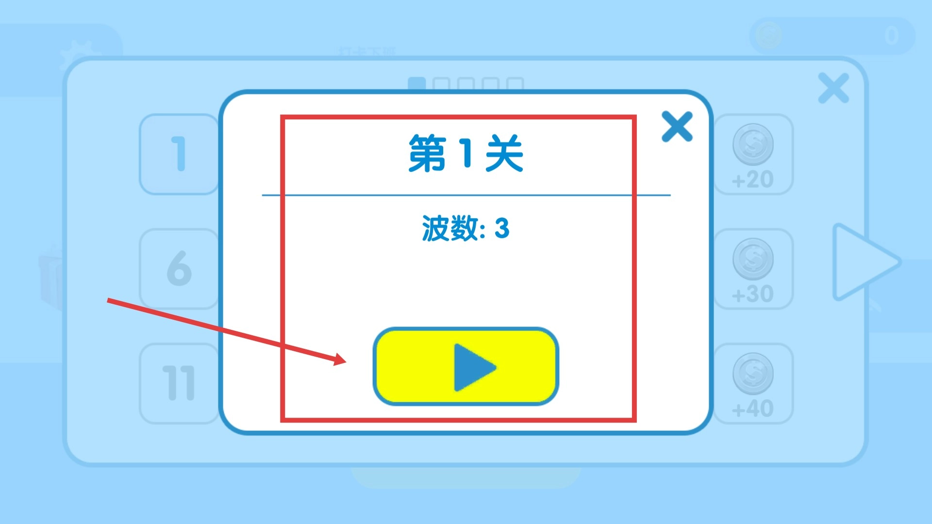 在关卡选择界面,挑选【第1关】中波数为【3】的关卡,点击黄色的开始按钮,即可进入该关卡进行具体挑战。