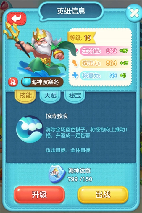 波塞冬是后期的蓝色系英雄,他的技能“惊涛骇浪”能够清除场上所有蓝色棋子,同时把所有怪物向上推移1格并造成相应伤害。其天赋包含提高伤害、增加怪物推动距离、提升暴击率等效果,是一位实力强劲且能力全面的英雄。