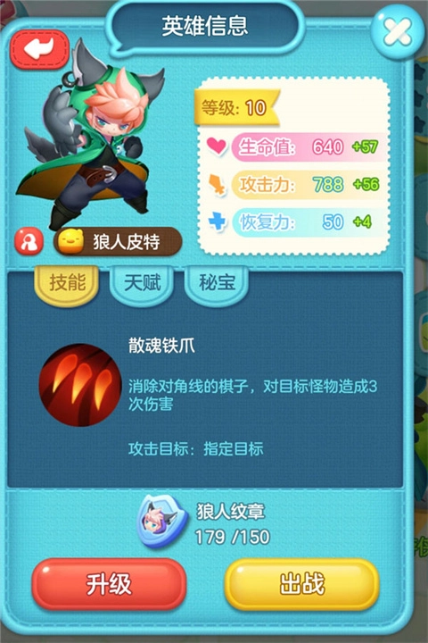 狼人皮特属于黄色英雄,他的技能名为散魂铁爪,能够清除对角线方向的棋子,并且对目标怪物发起3次攻击。此外,他在天赋方面具备提升攻击力、增加额外攻击次数以及回血等能力,再加上他的攻击力数值成长是最高的,因此狼人皮特成为了玩家们热门选择的输出型英雄。