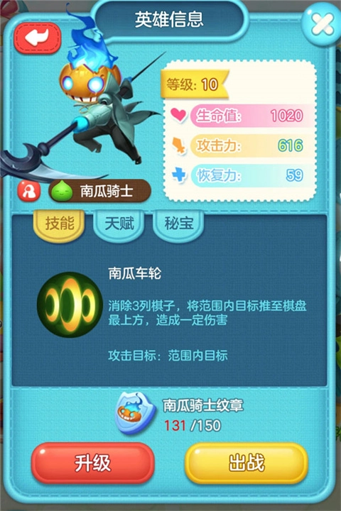 南瓜骑士属于绿色阵营的英雄,其技能机制为清除棋盘上的3列棋子,同时将技能范围内的目标单位推送至棋盘顶端,并附带相应的伤害输出;天赋方面涵盖攻击力提升、眩晕控制以及伤害加成等效果。该英雄的技能在对抗移动速度迟缓或采取近距离攻击方式的怪物时表现尤为出色,不过其技能存在一个局限,即无法对BOSS级目标产生作用。